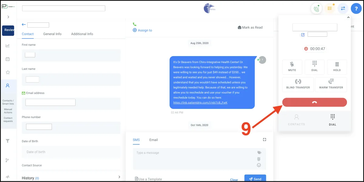 9. End the call by pressing the red button. If you did not expand the dialer, use
